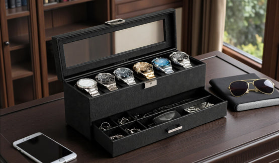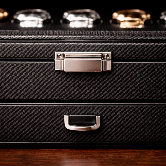 Dieses hochwertige Uhrenetui besticht durch sein elegantes, strukturiertes Carbonfasergehäuse und einen transparenten Glasdeckel, der Platz für sechs Herrenuhren bietet. Die gepolsterte Innenseite schützt jede Uhr, während polierte Metallelemente für einen Hauch von Luxus sorgen. Ein modernes, maskulines Etui, perfekt zur Aufbewahrung und Präsentation einer erlesenen Uhrensammlung.